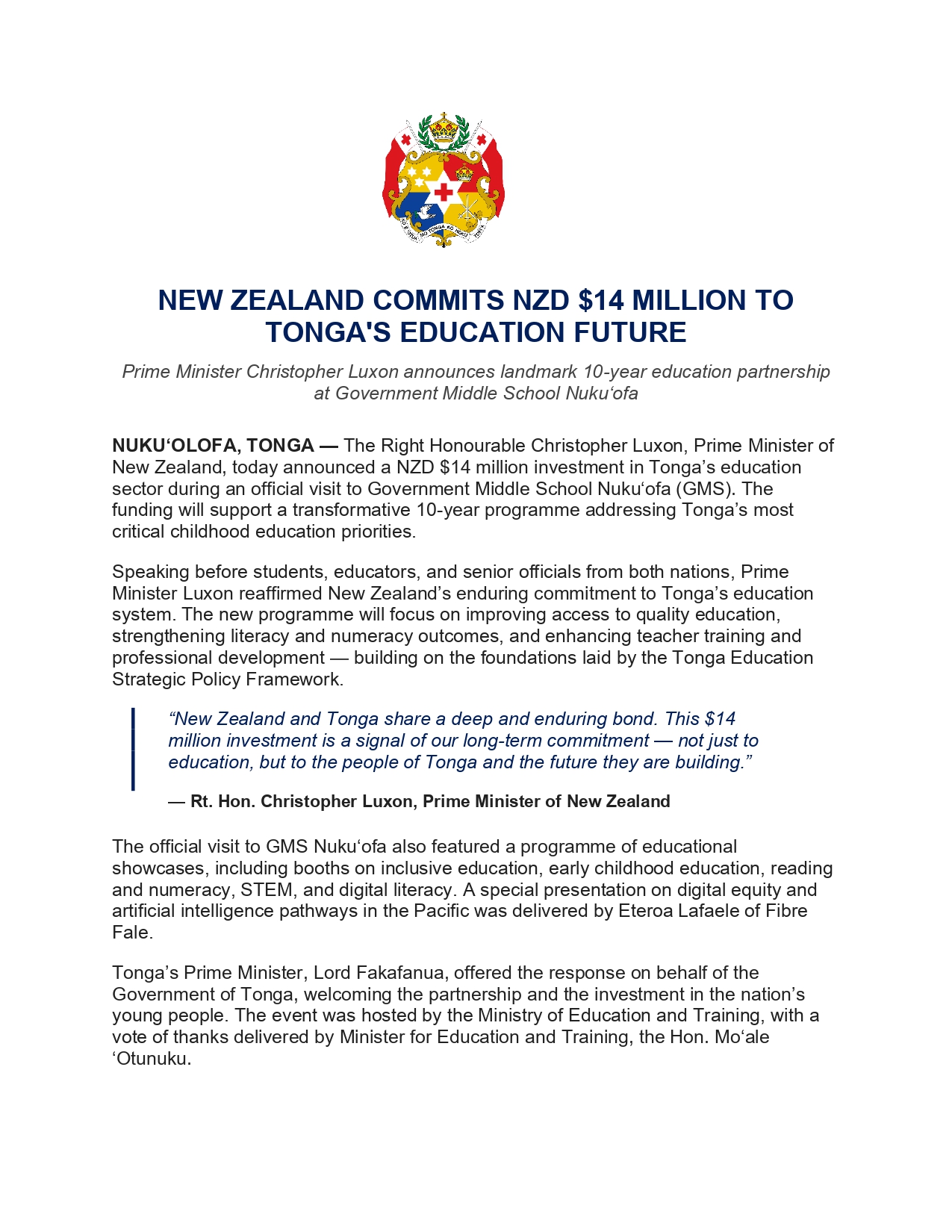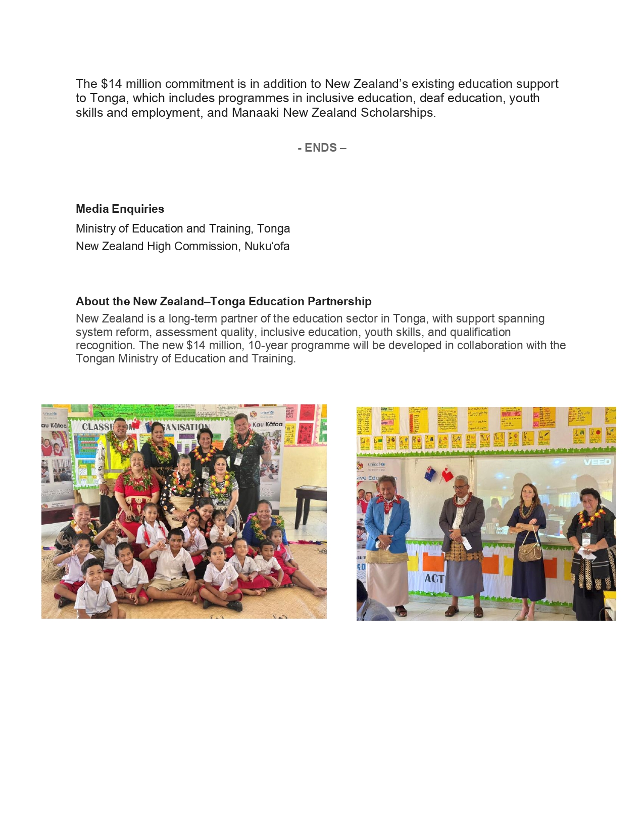NEW ZEALAND COMMITS NZD $14 MILLION TO TONGA'S EDUCATION FUTURE