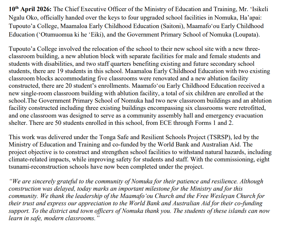 PRESS RELEASE : Handover of Reconstructed Schools in Nomuka, Ha’apai